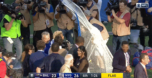 Things must have gone well for the two former foes over the ensuing week because Beckham got down on one knee and proposed to his new love after scoring the decisive touchdown in a win the following Sunday: